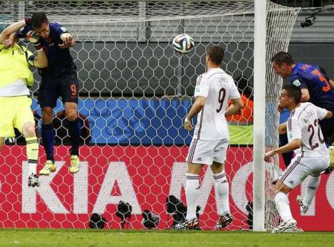 Por alguns minutos, os espanhóis conseguiram envolver os holandeses em seu tiki-taka, criando chances como a de David Silva, que aos 43min recebeu passe pela esquerda e tentou encobrir Cilesse, mas o goleiro desviou para fora. Antes, a Holanda havia perdido uma grande chance: aos 9min, com lançamento de Robben para Sneijder e grande defesa a queima-roupa de Casillas. O empate surgiu de forma bela: aos 44min, Blind deu longo lançamento para Van Persie, que viu Casillas ensaiar a saída do gol, então mergulhou de peixinho para, de cabeça, encobrir o goleiro.