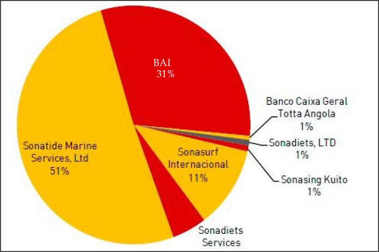 Marine Services com 51%, seguida do BAI com 31%, da Sonasurf Internacional 11%, da Sonadiets Services com 5% e da Sonasing Kuito, Sonadiets Ltd e Banco Caixa Geral Totta Angola, todos, somados, representando 1%. Relativamente aos management fees, 70% foram da Sonamet e 30% da Sonaid.