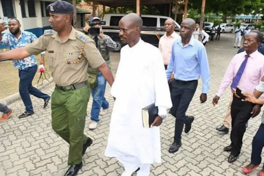 Vestido de branco e com uma Bíblia na mão, o pastor foi transportado à sede da polícia regional, em Mombaça.