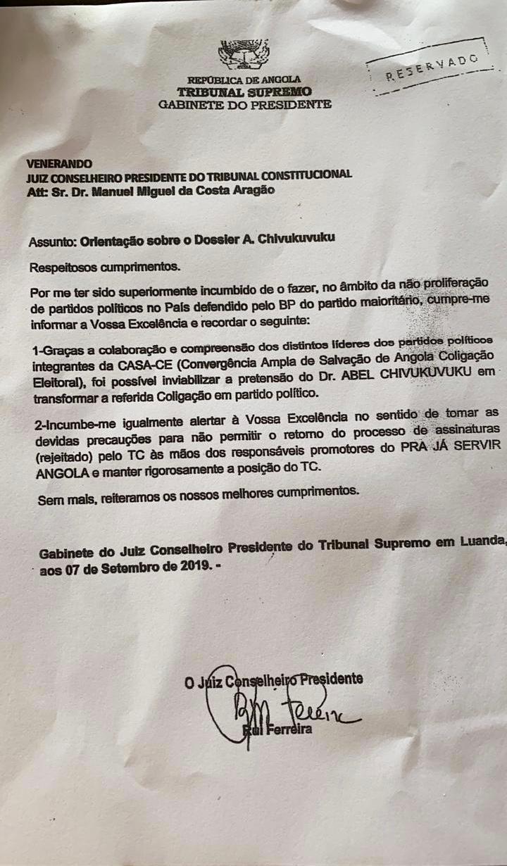 O director do Gabinete dos Partidos Políticos do Tribunal Constitucional (TC), Juvenis Paulo, negou a recepção, naquela instituição, de uma carta do juiz jubilado Rui Ferreira a solicitar o impedimento da legalização do partido PRA-JA Servir Angola, de Abel Chivukuvuku.