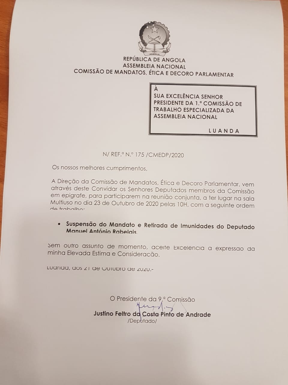 Os deputados da Comissão de Mandatos, Ética e Decoro Parlamentar da Assembleia Nacional de Angola vão reunir-se na sexta-feira para avaliar a suspensão de mandato e retirada de imunidades ao antigo ministro da Comunicação Social e deputado, Manuel Rabelais.