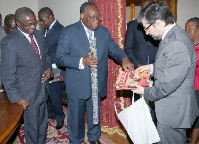 Roberto de Almeida, entrega lembrança após a reunião com o homólogo do PSD, Marcos António Costa, na sede do partido. Luanda Roberto de Almeida, entrega lembrança após a reunião com o homólogo do PSD, Marcos António Costa, na sede do partido. Luanda