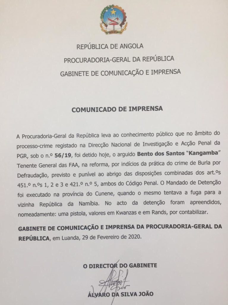 O general Bento dos Santos ‘Kangamba’ foi detido este sábado 29 de fevereiro pelo crime de burla por defraudação segundo informa a Procuradoria Geral da República de Angola, em comunicado.