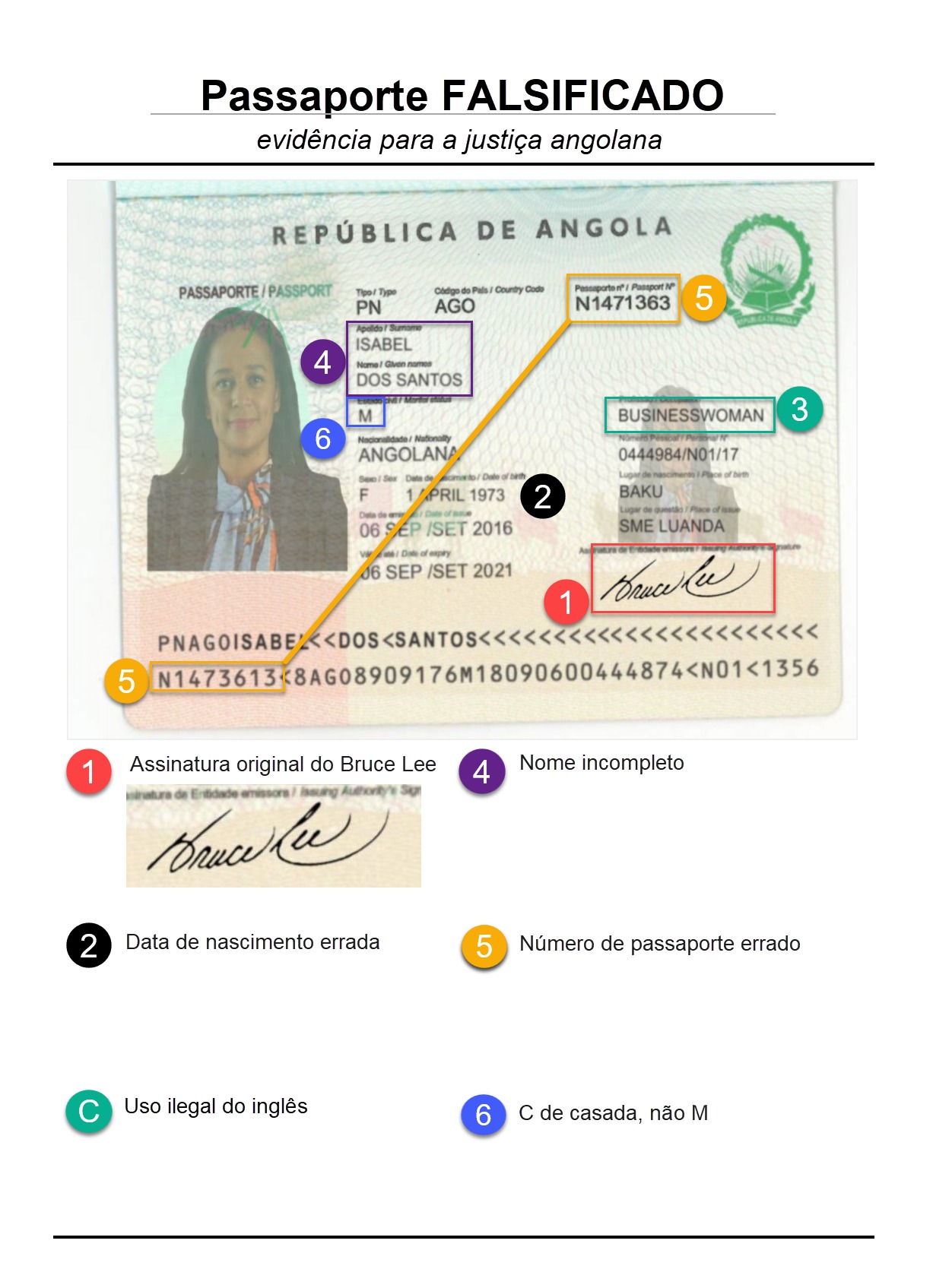 A empresária angolana alega que são vários os sinais de falsificação e que é “pouco credível que o Estado angolano não pudesse distinguir um passaporte falso de um documento verdadeiro por si emitido”. Nomeadamente que não tivesse detetado a “maior aberração” de o passaporte ter a “assinatura do falecido mestre de kung-fu e ator de cinema Bruce Lee”. Mas há mais sinais: a foto do passaporte foi tirada da internet, a data de nascimento está incorreta, apresenta várias palavras em inglês (“businesswoman” e “married”) quando a língua oficial de Angola é português, por exemplo.