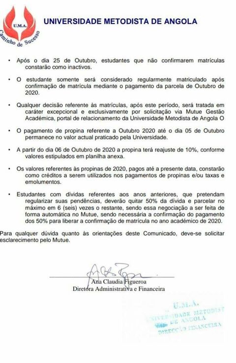 A UMA deliberou que o estudante só será considerado regularmente matriculado, após confirmação de matrícula mediante o pagamento da parcela de Outubro de 2020, sendo que qualquer decisão referente às matrículas, após este período, será tratada em caráter excepcional e exclusivamente por solicitação via Mutue Gestão Académica, portal de relacionamento da Universidade Metodista de Angola.