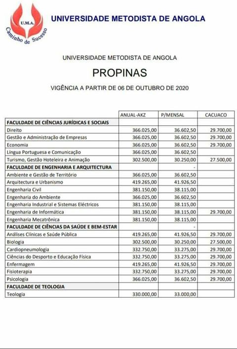 Através de um comunicado desta instituição, que Angola24Horas teve acesso, já com actualização das alterações feitas na tabela de preços, a exigência de uma reconfirmação de matrículas, foi igualmente possível observar um aumento de pelo menos 5 mil kzs do valor da propina, face ao reinício do presente ano académico.