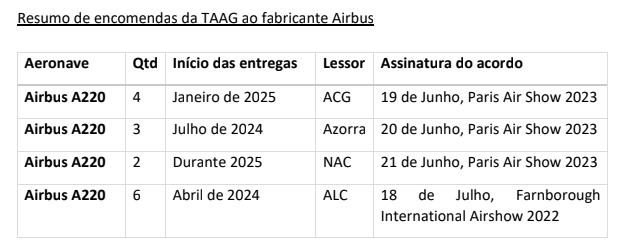 O documento realça que, atualmente, e através dos parceiros internacionais, a TAAG tem um total de 15 aeronaves modelo A220-300 encomendadas ao fabricante Airbus, com estimativa de entregas faseadas a partir de abril de 2024.